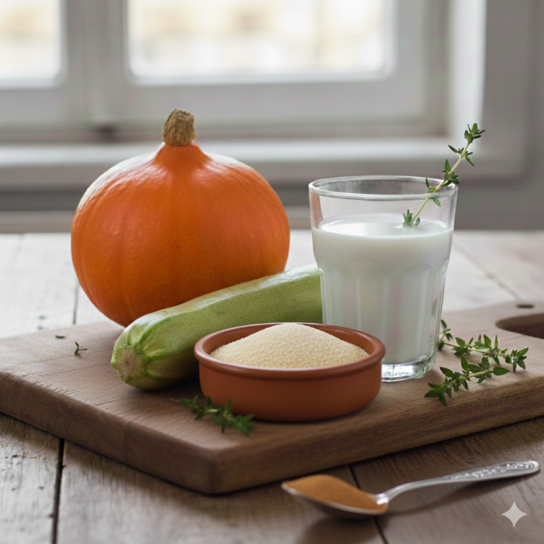 Pour 4 personnes – Préparation : 20 mn – Cuisson : 25 mn Ingrédient : 5OO gr de potiron 1 courgette 2 cuillères à soupe de polenta 1 verre de lait de coco 1 branche de thym 1 pincée de cannelle Poivre Sel …